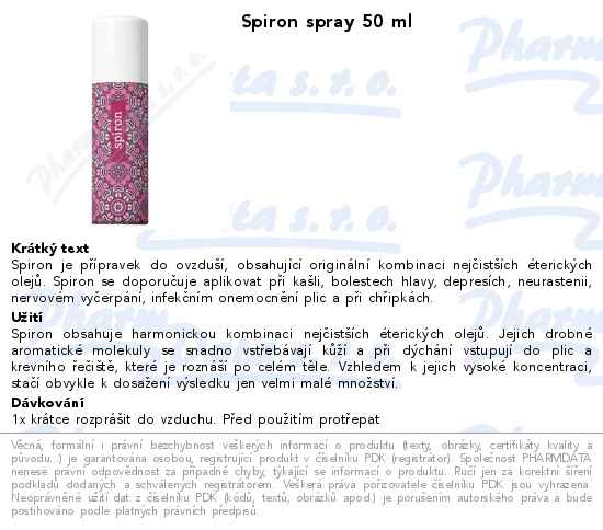 Spiron se doporučuje aplikovat při kašli, bolestech hlavy, depresích, neurastenii, nervovém vyčerpání, infekčním onemocnění plic a při chřipkách.