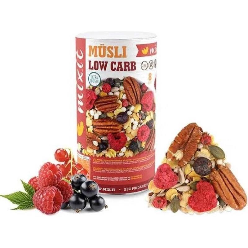Hledáte chutné snídaňové či svačinové müsli s minimem sacharidů a vydatnou porcí bílkovin a vlákniny? Přesně pro vás je tu první low carb müsli od Mixit. Smlsněte si na chutném výběru sušeného ovoce, křupinek, pekanových ořechů a 3 druhů semínek. Směs obsahuje jen 10 % sacharidů, z toho jen 5,1 % cukrů z černého a červeného rybízu s malinami. Zároveň je toto müsli nabité bílkovinami: obsahuje jich 28 % v kombinaci rostlinné a syrovátkové složky, což uspokojí i náročné sportovce. Mixit müsli si zamilujete, ať už jej zalijete mlékem, přidáte do jogurtu nebo kaše, nebo si jej dáte prostě jen tak.