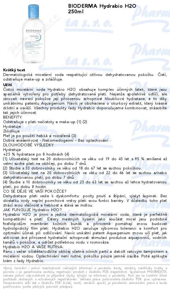 Bioderma Hydrabio H2O 250ml je čisticí a odličovací micelární voda na dehydratovanou a citlivou pleť. Dokonale a jemně čistí, navozuje pocit svěžesti. Důkladně odstraňuje i voděodolný make-up. Nedráždí oči.