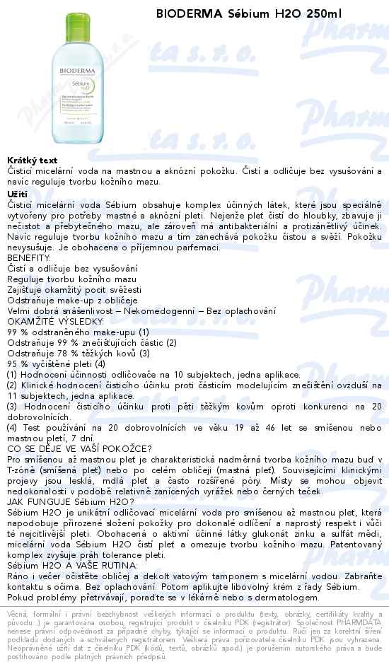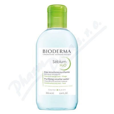 Bioderma Sébium H2O - čisticí pleťová voda - micelární roztok vhodný pro mastnou pokožku, pro pokožku se sklonem k akné. Odstraňuje nadbytek mazu bez podráždění kůže a působí antibakteriálně.