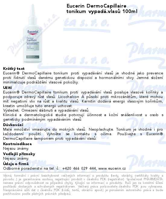 EUCERIN Eucerin DermoCapillaire tonikum proti vypadávání vlasů je vhodné jako prevence proti řídnutí vlasů danému genetickou dispozicí a hormonálními vlivy. Jemné složení minimalizuje podráždění vlasové pokožky.